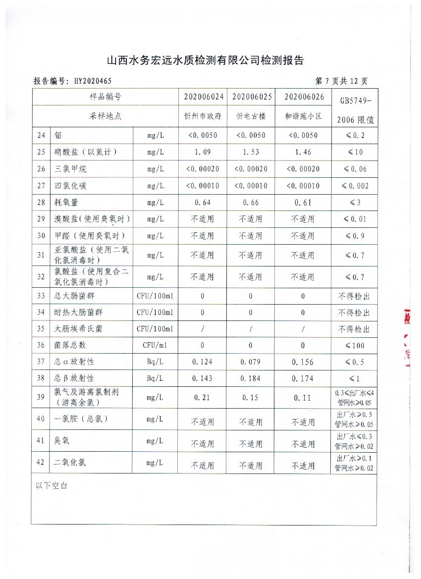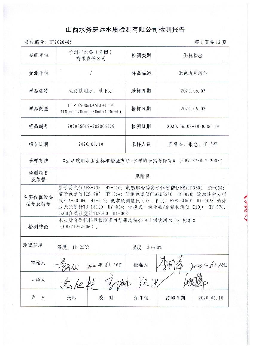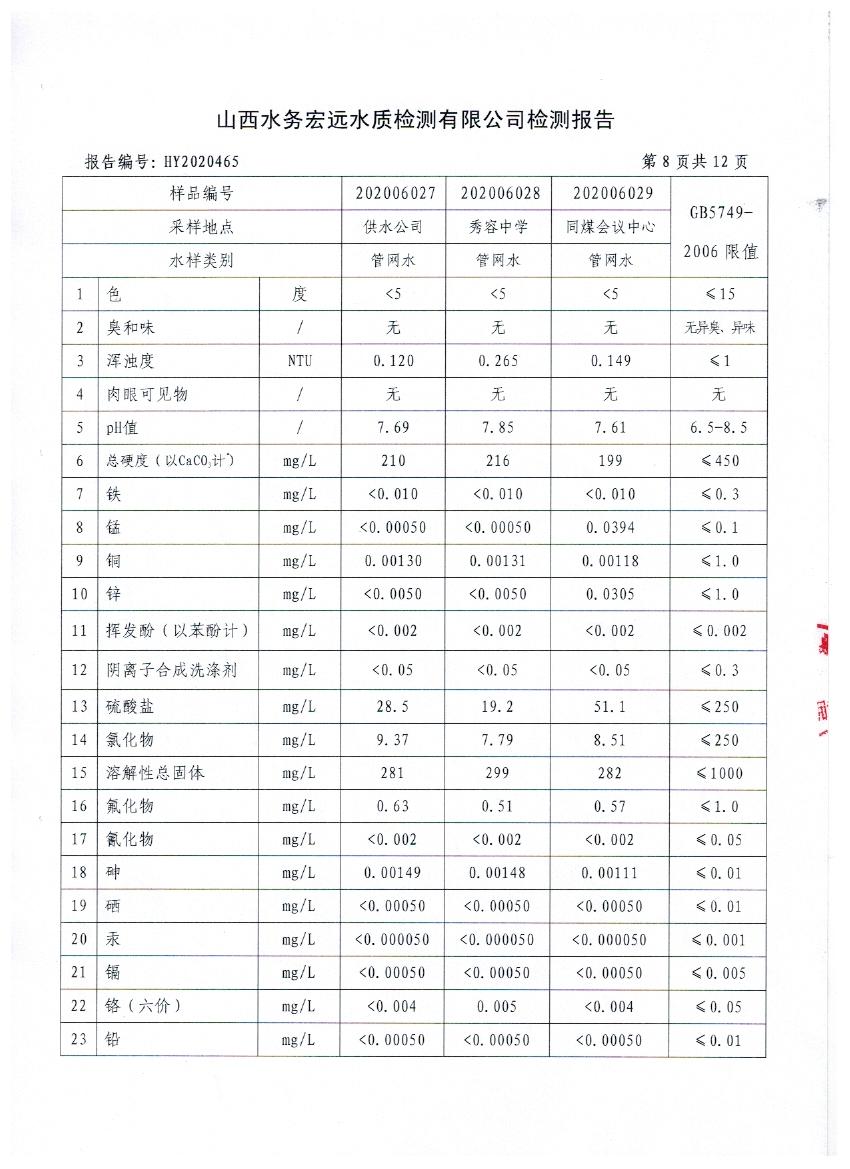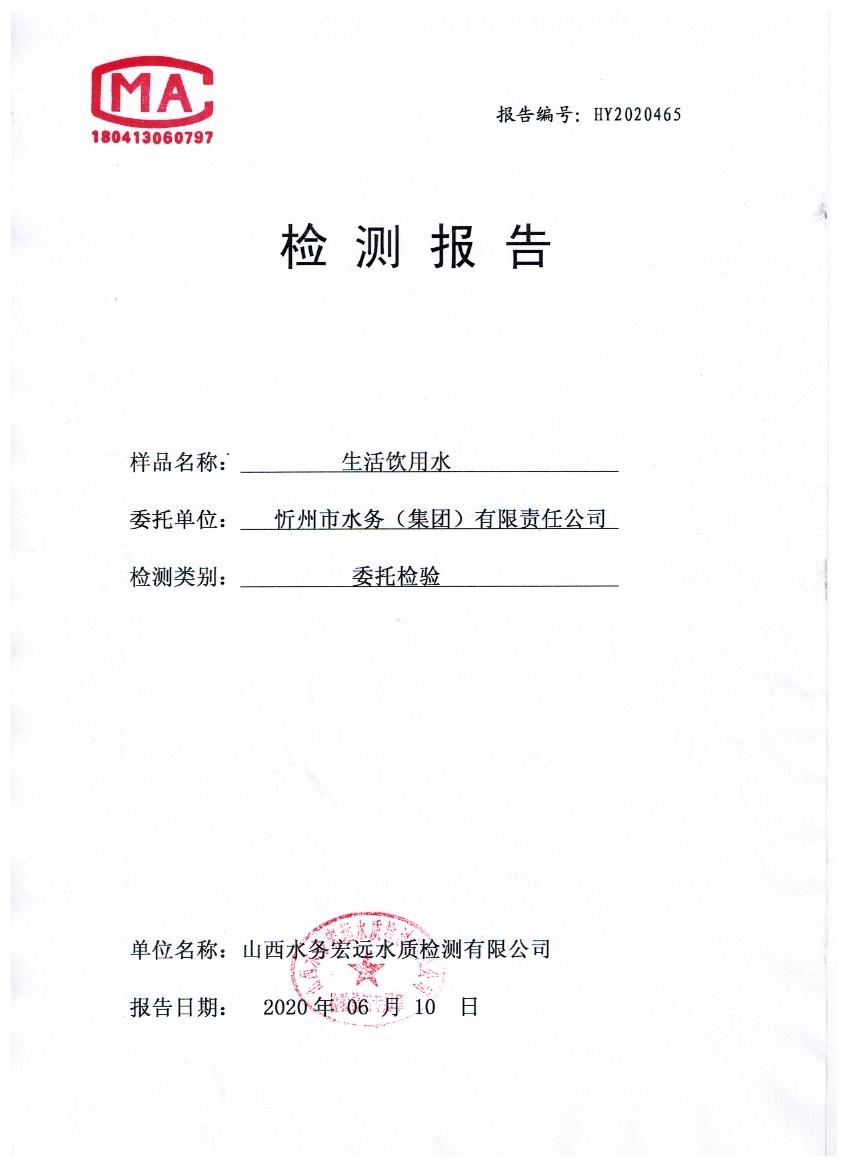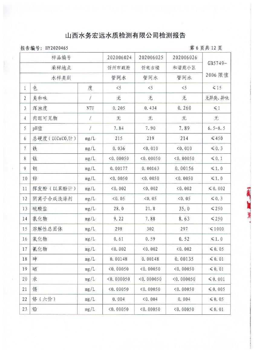 忻州城區(qū)公共供水水源水、出廠水、管網(wǎng)水、管網(wǎng)末梢水2020年6月份水質信息公示