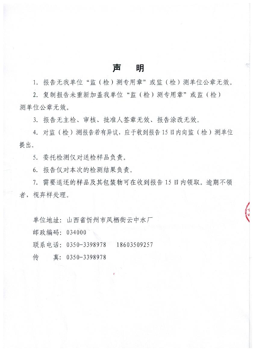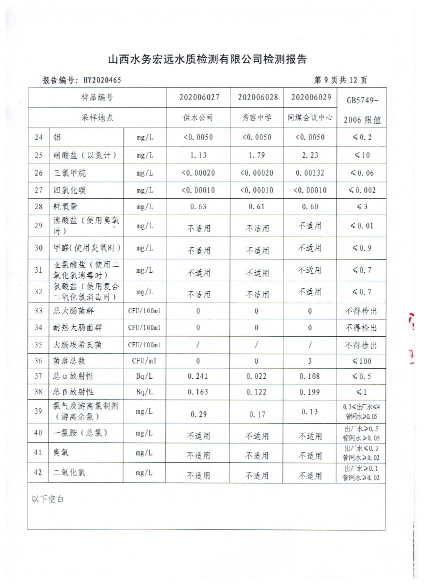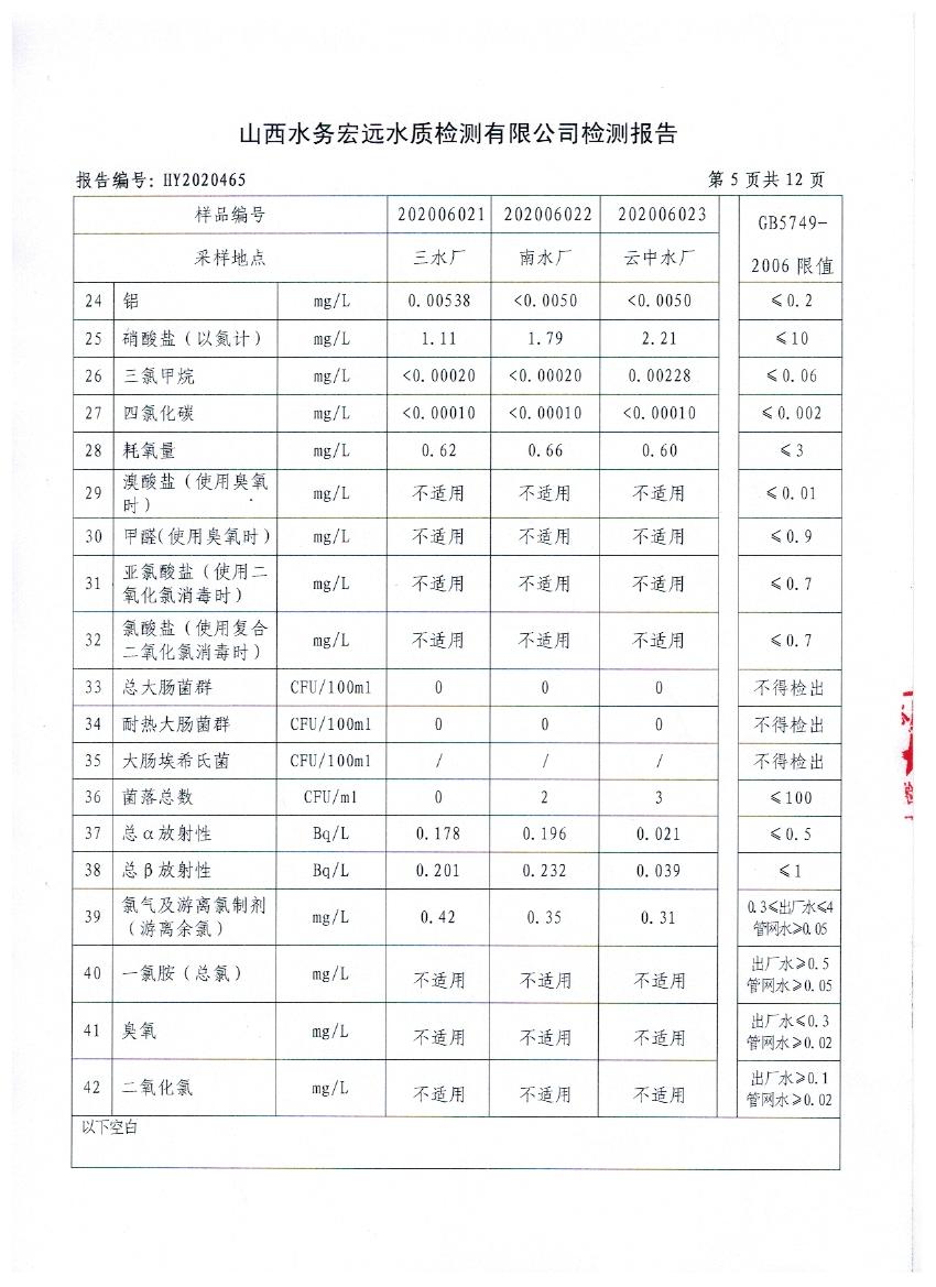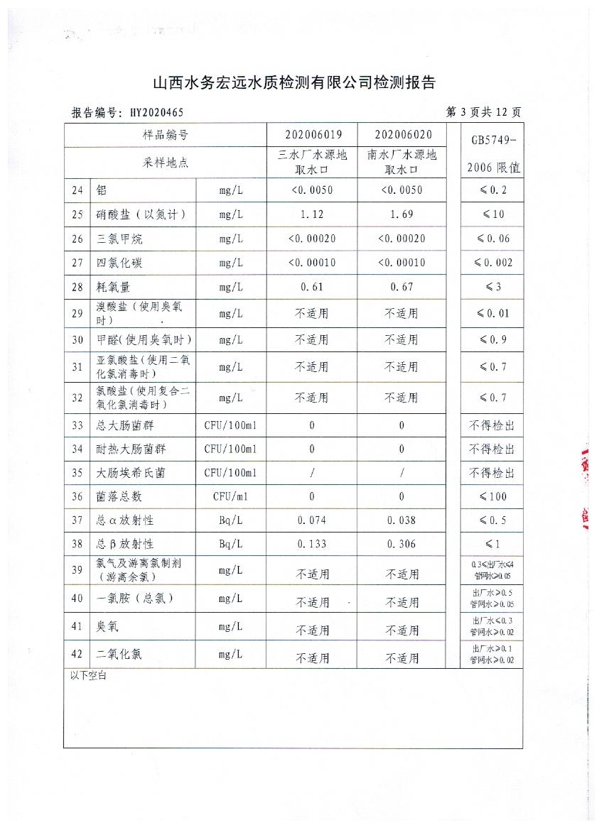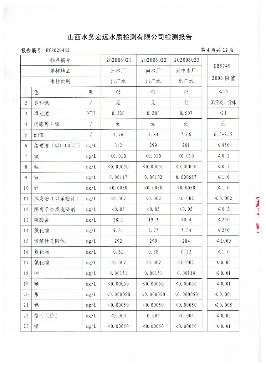 忻州城區(qū)公共供水水源水、出廠水、管網(wǎng)水、管網(wǎng)末梢水2020年6月份水質信息公示