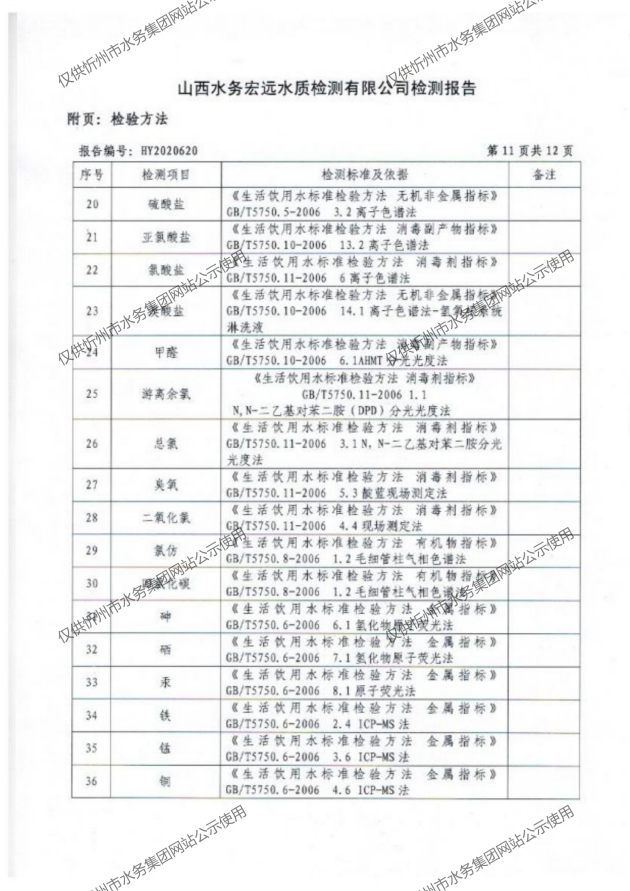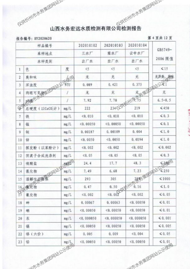 忻州城區(qū)公共供水水源水、出廠水、管網水、管網末梢水2020年10月份水質信息公示