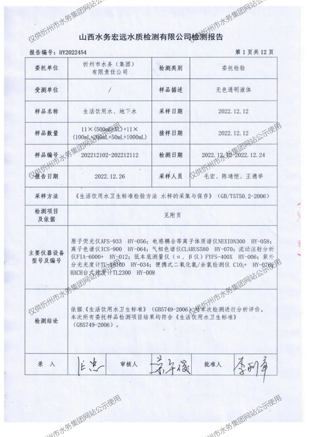 忻州城區(qū)公共供水水源水、出廠水、管網(wǎng)水、管網(wǎng)末梢水2022年12月份水質(zhì)信息公示